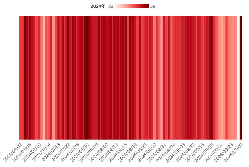 1日ごとに気温が高い日ほど濃い赤で色付けしているのですが、一目瞭然で2024年の方が赤が濃いのがわかると思います。